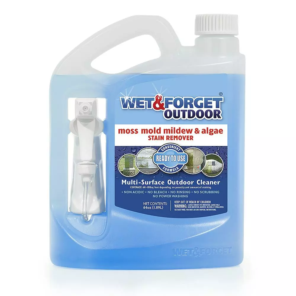 Effectively clean up moss, mold, mildew and algae without any scrubbing. Simply spray Wet and Forget Ready-To-Use on, and forget it. Wet and Forget Ready-To-Use comes premixed with an easy-to-use trigger sprayer to treat virtually any small outdoor surface. The attached sprayer reaches up to 10 Ft. high, providing better and faster coverage at any angle. One bottle will cover 60-180 square feet, depending on the porosity and severity of the staining. The premixed formula is bleach free, phosphate free. Wet and Forget Ready-To-Use is perfect to use to treat small surfaces such as umbrellas, planters, statues and porch steps.